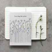 Capture your thoughts and reminders in this charming small notebook, featuring the inspiring message "You are stronger than you think" on the cover. Adorned with a delicate floral design, it brings a touch of beauty and encouragement to your everyday writing. Crafted by East of India, this notebook is perfect for personal reflection or as a thoughtful gift to uplift someone special. Embrace strength and positivity with every page you fill.