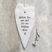 This elegant porcelain long heart by East of India carries the inspiring message "Believe you can and you are halfway there." Perfect for adding a touch of motivation and charm to your home, it serves as a daily reminder to stay confident and focused on your goals. Crafted with care, this decorative piece blends style and inspiration effortlessly.